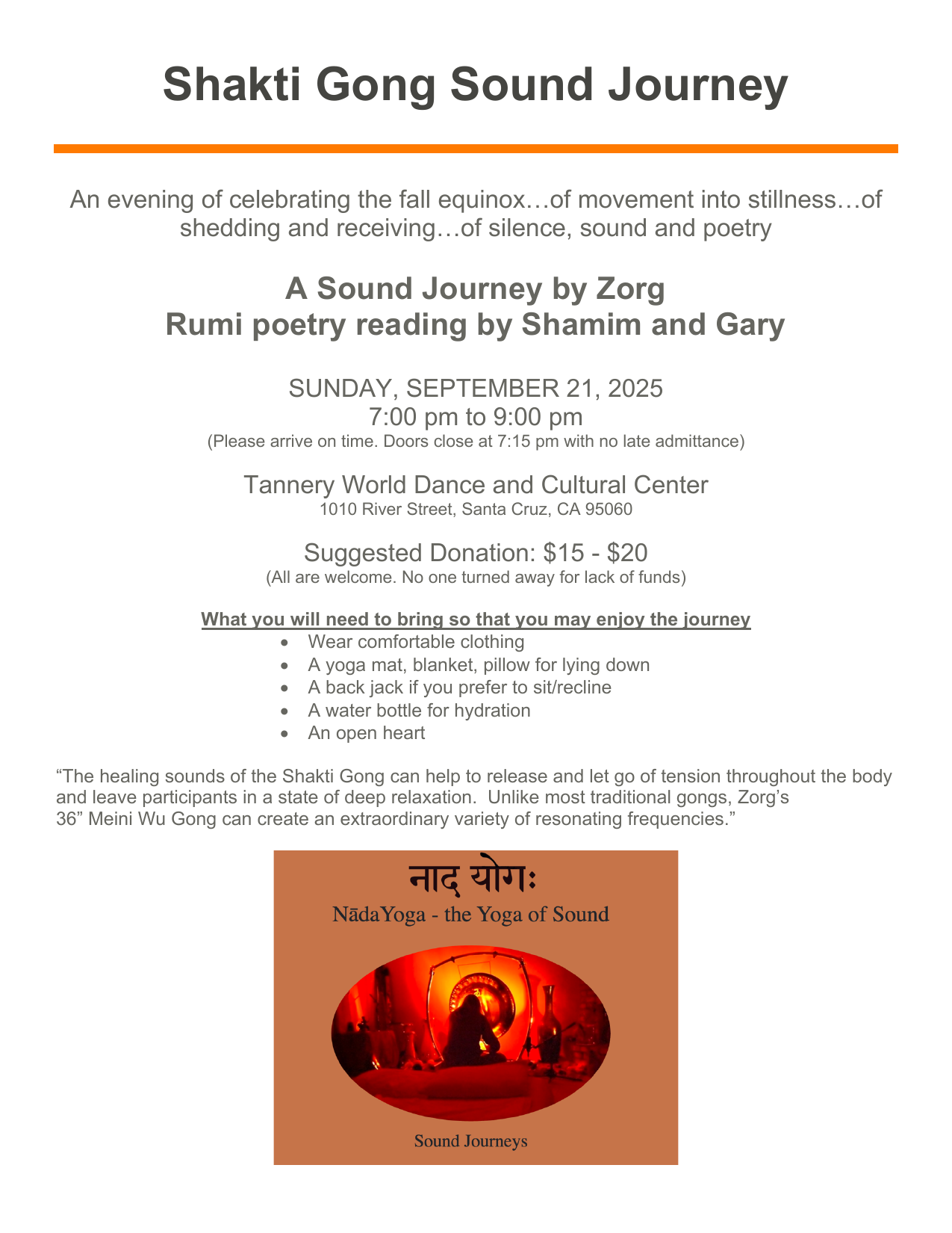 Zorg offers many kinds of Shakti Gong journeys. Some focus on moving energy through the seven chakras, while others explore huge sonic landscapes that support conscious letting go. His next public full-length sound journey will be at the Tannery in Santa Cruz, Sunday 21st Sept. And on October 9th Zorg will be playing Shakti Gong, didjeridoo, and other instruments for the Thursday Contact Improv Jam at Finnish Hall in Berkeley.
